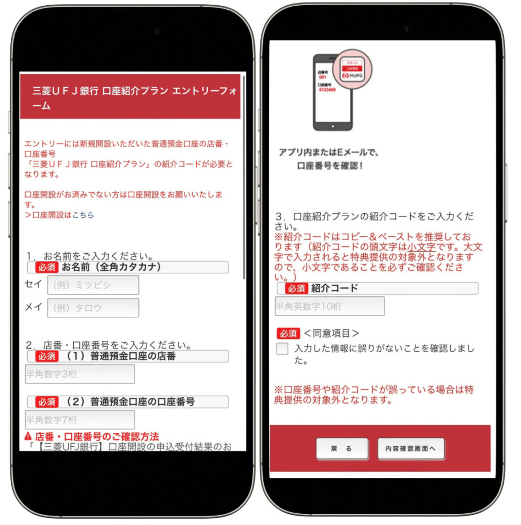 口座開設手続きが完了し、三菱UFJ銀行からメールが届いたら、友達紹介コードを入力します。