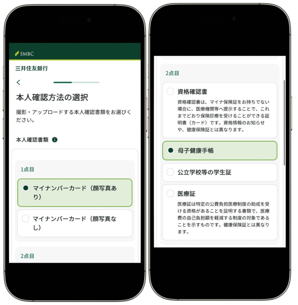 - 2点目:資格確認書 / 母子健康手帳 / 公立学校等の学生証 / 医療証 のいずれか