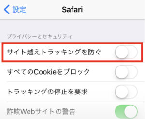 設定→safari→サイト越えトラッキングを防ぐ= OFF